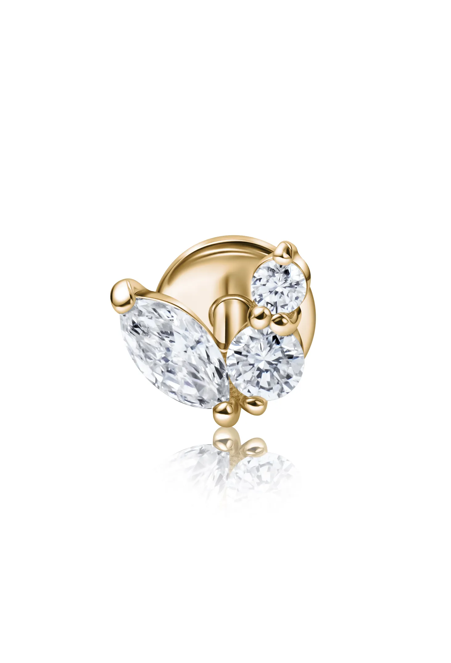 Камни: 1 бриллиант огранки «маркиз» (4 × 2 мм) + 2 круглых бриллианта (1 мм, 57 граней).
